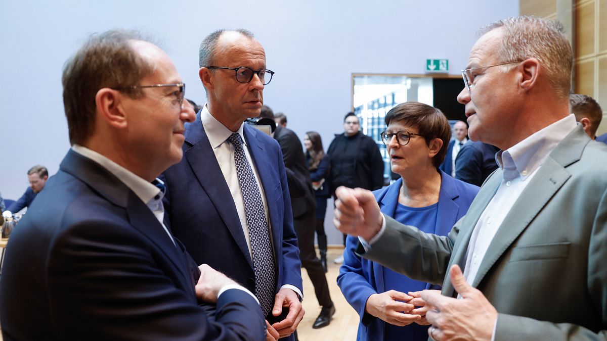 Le ministre bavarois, le président Markus Söder et les présidents du parti SPD, Lars Klingbeil et Saskia Esken, ont rejoint Merz pour parler de leur optimisme pour les négociations de la coalition.