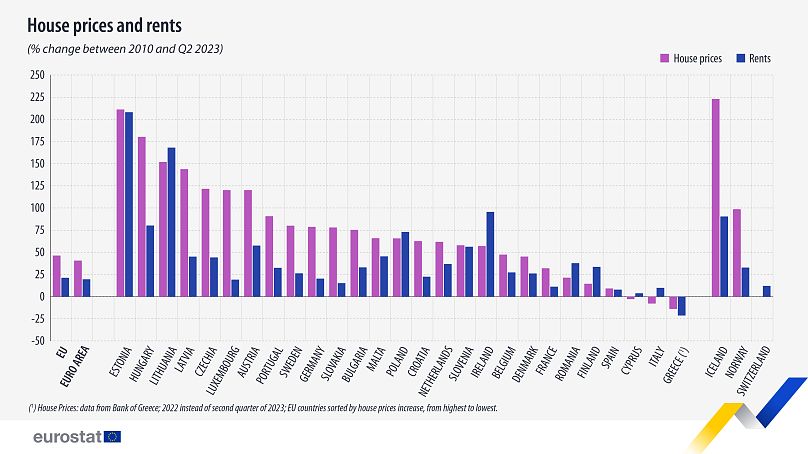 Si l’on compare le deuxième trimestre 2023 avec 2010, les prix de l’immobilier ont augmenté plus que les loyers dans 20 des 27 pays de l’UE.