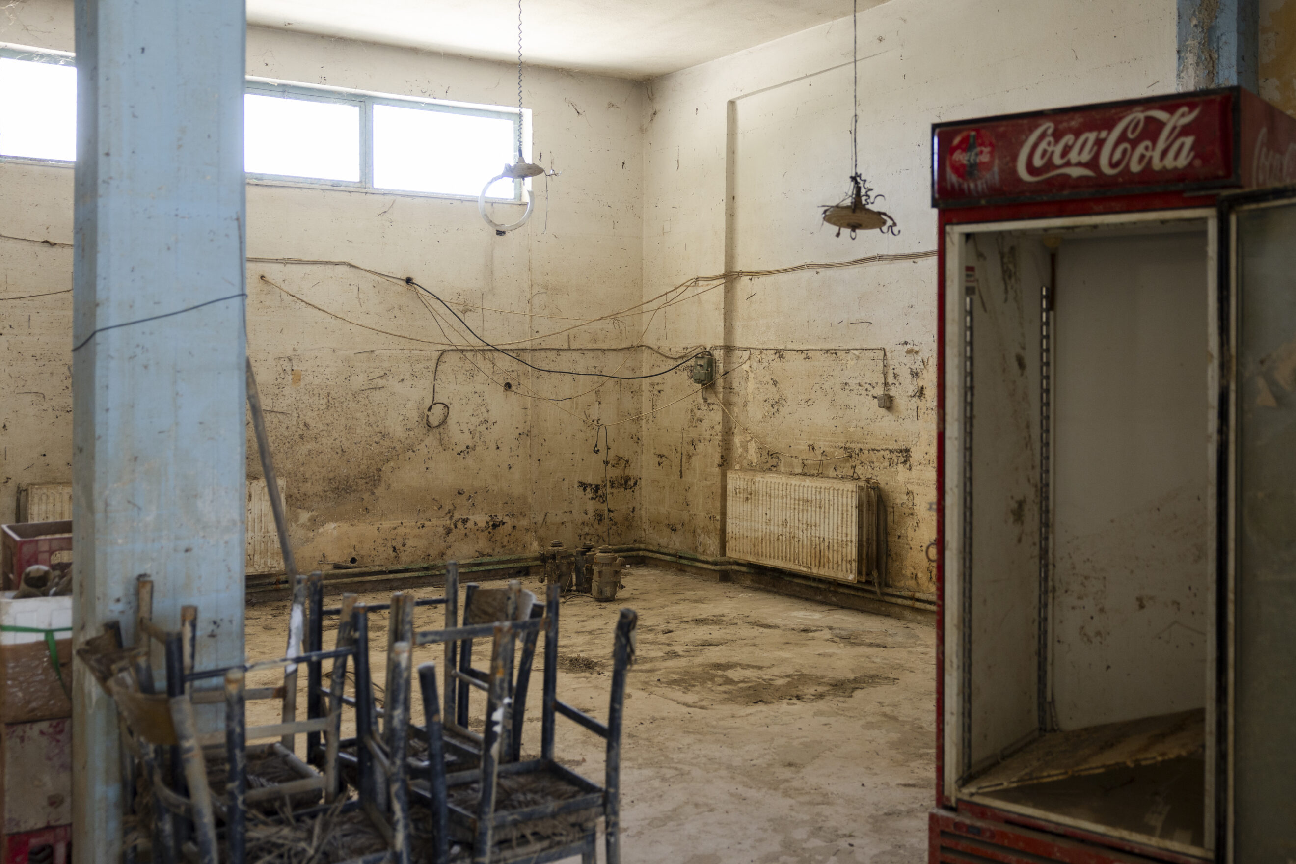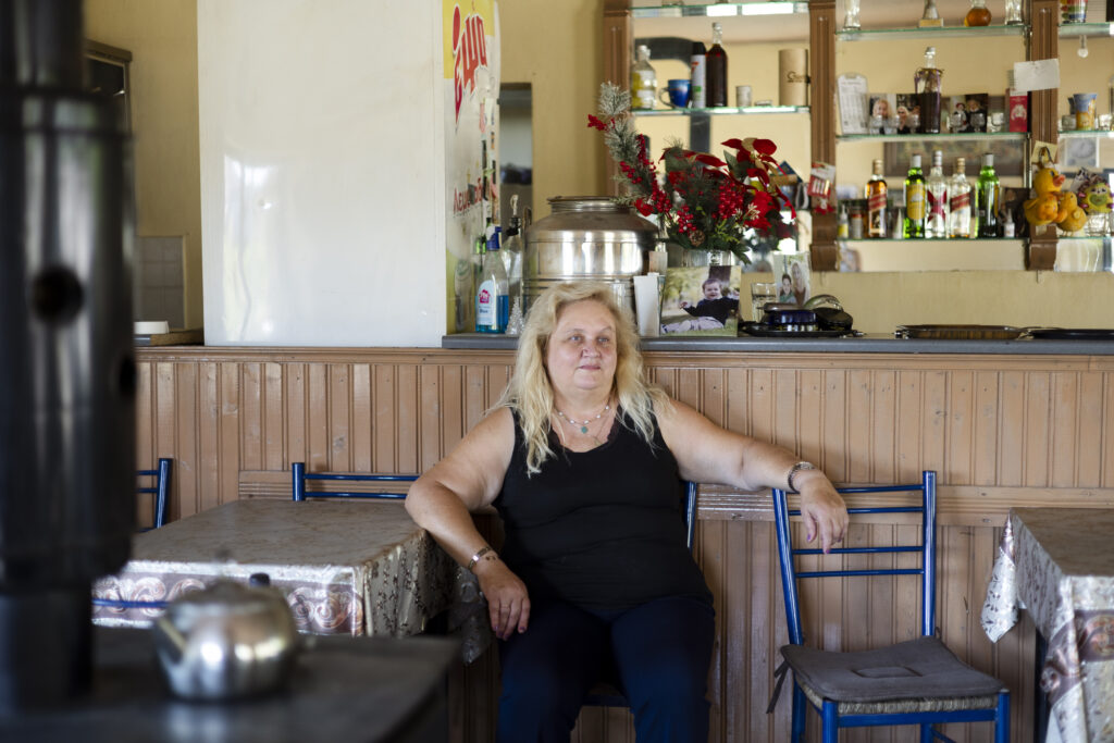 Ci-dessus, Fani Ntantou, 55 ans. Elle possède un café local et est l’une des rares qui sont revenus à Metamorfosi, ensemble son mari de 67 ans. En bas, George Didagelos, vu ci-dessous dans une unité de reproduction détruite de sa ferme porcine désormais abandonnée, à Koskina.