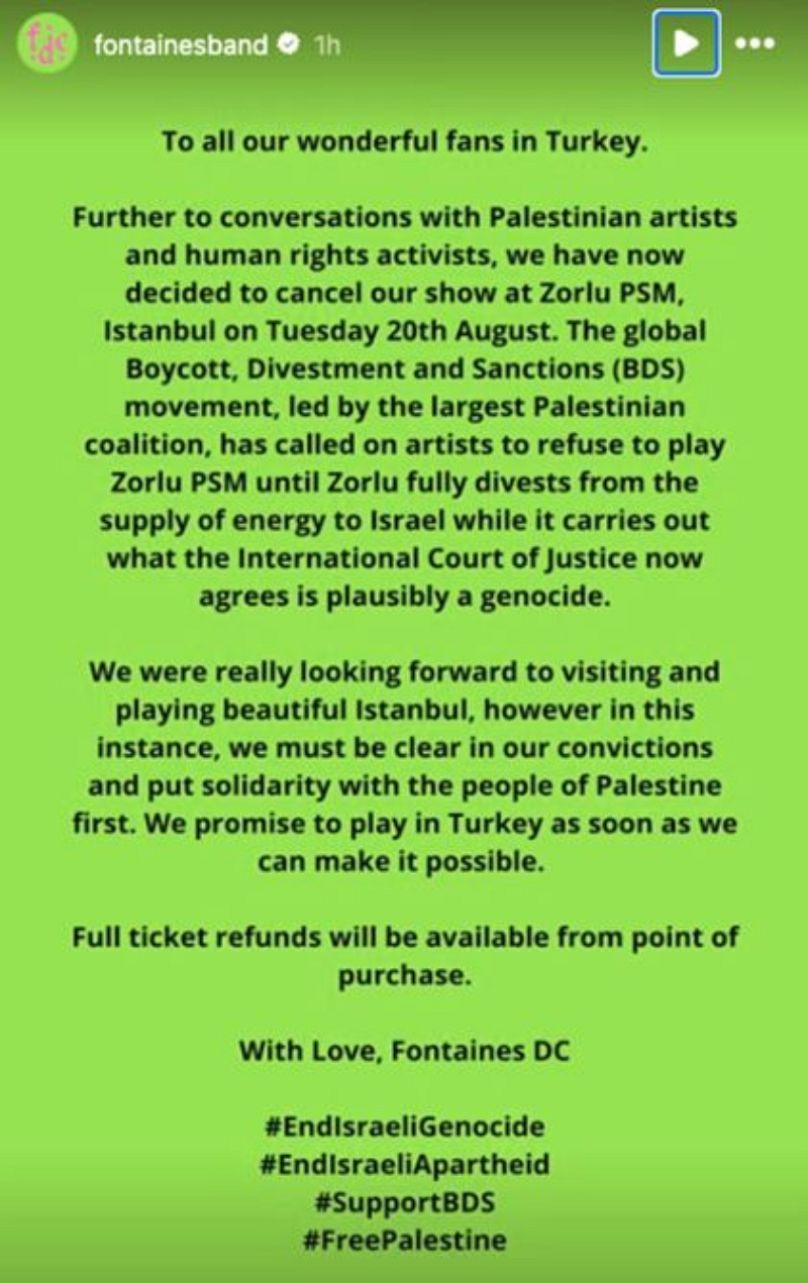 Le groupe de post-punk irlandais Fontaines DC a annulé son concert prévu à Istanbul en Turquie, en solidarité avec le peuple palestinien.