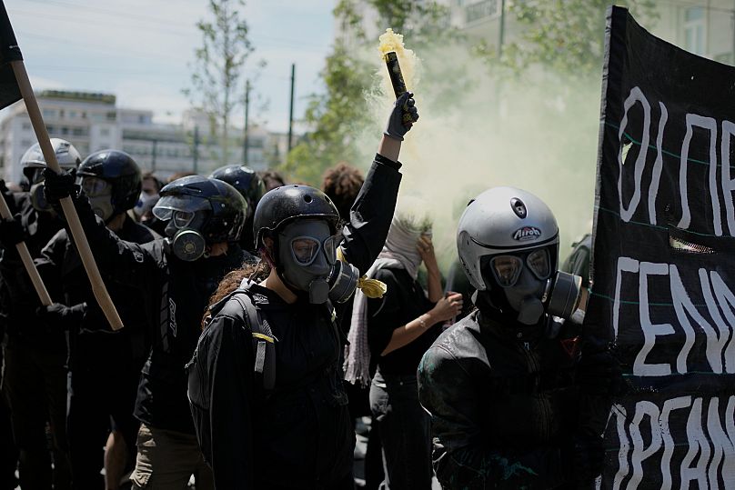 Un manifestant d'un groupe anarchiste tient une poussée de fumée lors d'un rassemblement de mai à Athènes, le 1er mai 2025