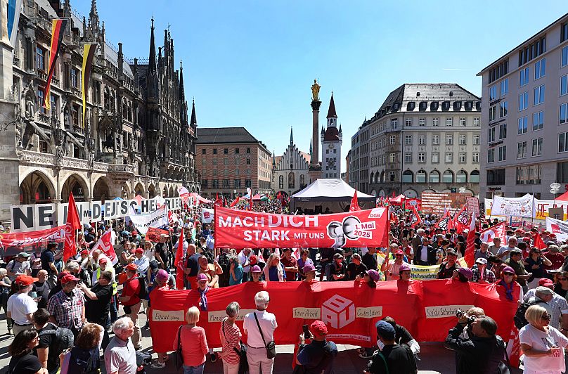 Participants à un rallye marquant la fête du Travail March à Munich, 1er mai 2025