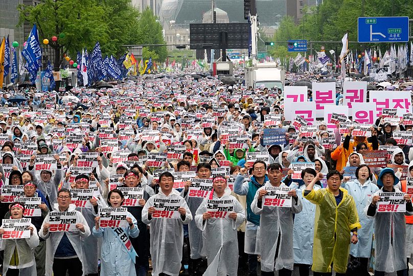 Les membres de la confédération coréenne des syndicats se réunissent pour assister à un rassemblement le 1er mai à Séoul, le 1er mai 2025