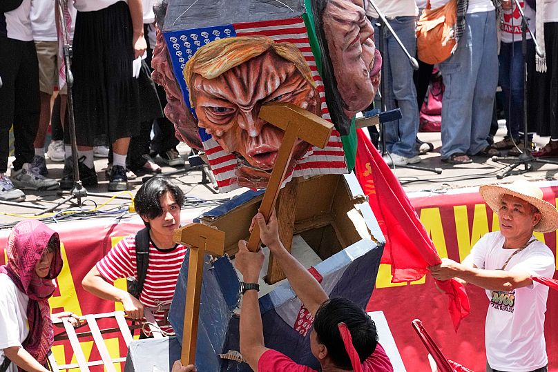Des militants et des travailleurs ont frappé une figure du président américain Donald Trump lors d'un rassemblement de mai à Manille, le 1er mai 2025