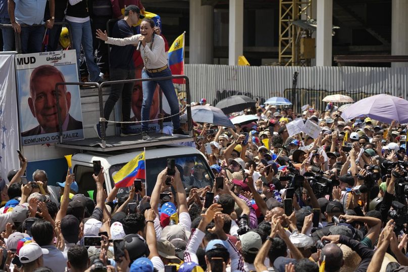 Alors que des milliers de Vénézuéliens brandissaient le drapeau national, la cheffe de l’opposition María Corina Machado a parcouru les rues de Caracas à bord d’un camion en criant « courage » et « liberté ». Puis, devant une foule, elle a déclaré que c’était le moment où « chaque vote est respecté ».