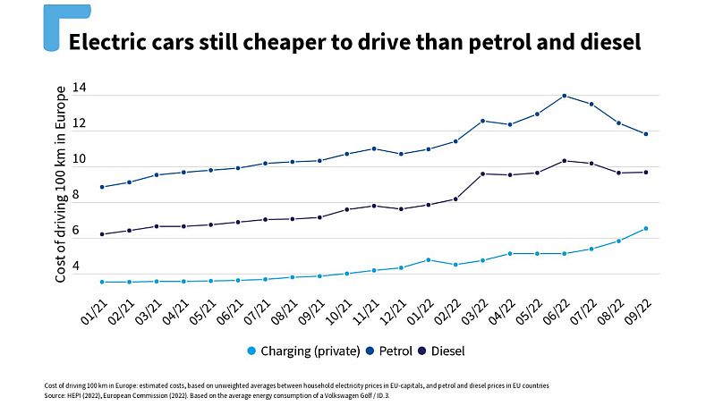 Une analyse T&E des prix de l’électricité pour les ménages dans les capitales de l’UE (les prix nationaux à jour ne sont pas disponibles) et des prix hebdomadaires de l’essence et du diesel montre que parcourir 100 kilomètres avec une voiture électrique moyenne en septembre 2022 coûte environ 6,50 € – si la voiture a été rechargée à la maison.