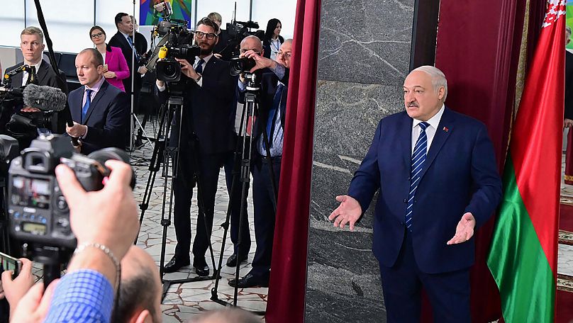 Le président biélorusse Alexandre Loukachenko s’adresse aux médias après le vote, dans un bureau de vote à Minsk, en Biélorussie, le dimanche 25 février 2024.