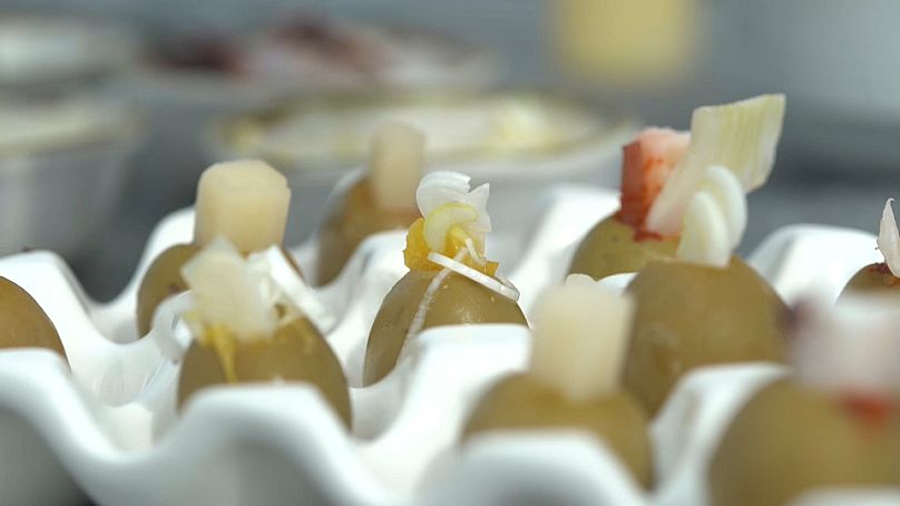 « Nous faisons une mousse avec la vinaigrette des olives au fenouil et à l’orange. L’olive a les quatre goûts de base : acide, salé, amer et sucré. Et cela donne à n’importe quel plat le « umami » que nous recherchons. L’olive a de l’umami », a déclaré le chef Daniel del Toro à L’Observatoire de l’Europe, alors qu’il préparait une tapas.