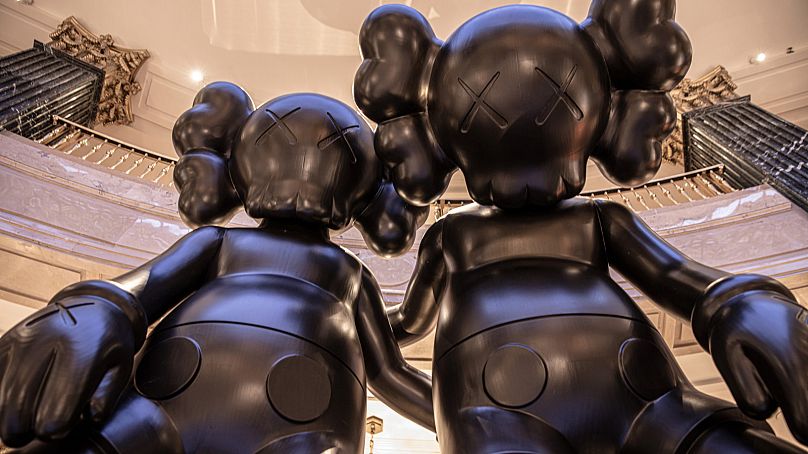 Le foyer du Four Seasons Madrid est orné d’une sculpture KAWS géante et fantaisiste représentant deux souris noires dessinées.