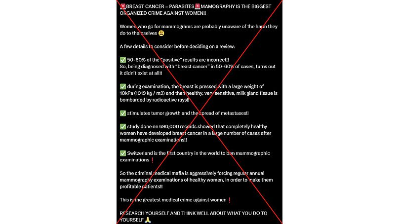 Les publications sur les réseaux sociaux qui ont circulé pendant des mois affirment faussement non seulement que la Suisse a interdit les dépistages du cancer du sein, mais que les procédures augmentent le risque de développer la maladie.