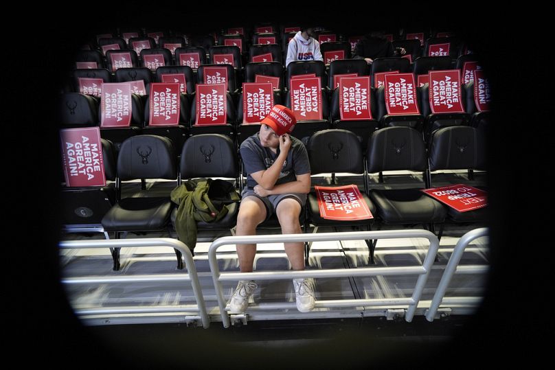 Les fans devant le rassemblement de Donald Trump à Milwaukee étaient de bonne humeur, souriant et riant – dans certains cas, de la bière à la main – alors qu’ils descendaient dans la Fiserv Arena de 18 000 places à quelques heures de l’arrivée de l’ancien président.