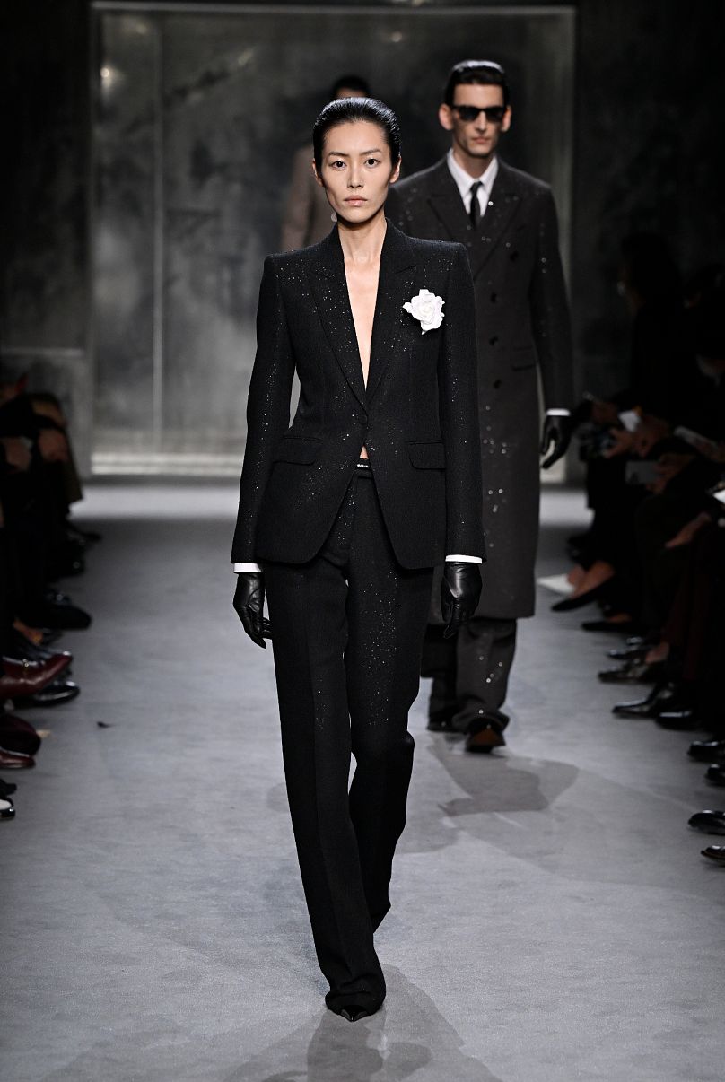 Comme Burton, Haider Ackermann de Tom Ford a opté pour une présentation intime – pour mieux voir sa palette de couture et de couleurs méticuleuse qui a vu l’absinthe vert façonné dans une robe de colonne à manches en satin Duchesse, de minuscules étincelles sur un costume de smoking immaculé et une couture masculine languissante dans le violet et la laine de pistache.