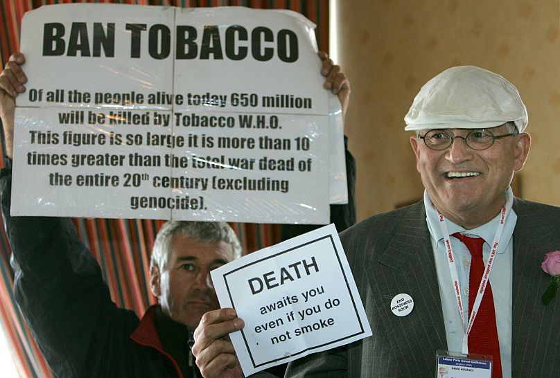 Hockney a fait campagne sans relâche contre l’interdiction de fumer de 2005 et est même apparu à la conférence du Parti travailliste la même année en tenant un panneau qui se lisait: «La mort vous attend tous même si vous fumez.»