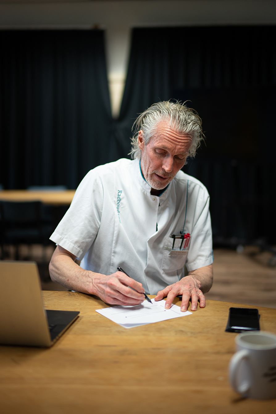 Bloem’s presence is both charismatic and kinetic: tall — just over 2 meters, he says with a grin — with a habit of walking while talking, and a white coat lined with color-coded pens. His long, silver-gray hair is swept back, a few strands escaping as he paces the room. Patients paint portraits of him, write poems about him. His team calls him “the physician who never stops moving.”