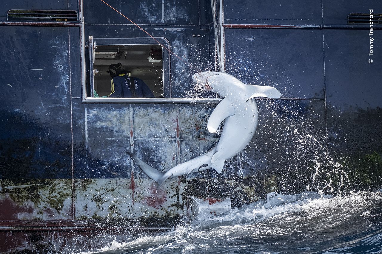Le photographe sud-africain Tommy Trenchard voyageait à bord du navire Arctic Sunrise de Greenpeace lorsqu’il a pris cette photo de la prise accessoire d’un requin requiem.