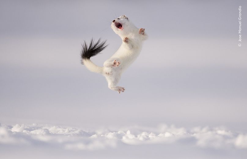 Le photographe espagnol Jose Manual Grandío a bravé des températures inférieures à zéro à Athose, en Bourgogne-Franche-Comté, en France, pour observer une hermine sauter dans la neige.