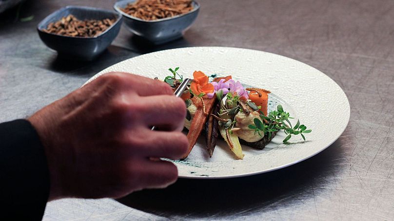Dans son restaurant parisien, le chef Laurent Veyet crée des plats de haute cuisine avec quelques twists : les insectes. Une assiette de jardin colorée avec des vers de farine et des grillons fait partie de sa vision culinaire éco-responsable pour un avenir alimentaire durable.