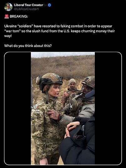 Un récit nommé « Liberal Tear Creator » a partagé une série de trois vidéos, alléguant que les soldats « semblaient au combat », afin d’apparaître « la guerre déchirée » et d’obtenir des fonds des États-Unis.