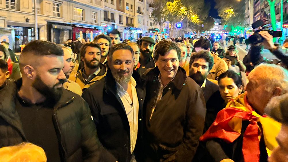 Tucker Carlson, héros de la presse d’extrême droite et ancien animateur de Fox News, a fait une apparition vedette lors de la manifestation espagnole aux côtés de Santiago Abascal, chef du parti d’extrême droite espagnol Vox.