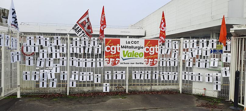 Des dizaines de croix funéraires bordent la route menant à l’usine du géant des pièces automobiles Valeo, dans le nord-ouest de la France.