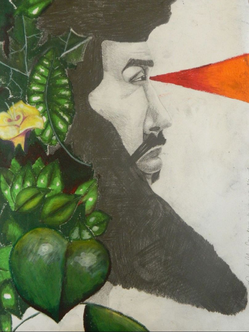 Pour certains artistes du spectacle, l’art est un moyen de défier et de redéfinir les récits sociétaux. Le défunt Derrick Alexis Colon, qui vivait avec un trouble schizo-affectif, a utilisé son travail pour explorer les thèmes de la masculinité noire, de la spiritualité et de la foi. Une pièce soumise à l’émission intitulée La vision de la guérison Comprend une figure barbu divine regardant vers l’avant, alors qu’un faisceau perçant de lumière orange éclate de son œil. Des fleurs luxuriantes et vibrantes et fleuries entourent sa forme, reliant le spirituel avec le monde naturel.