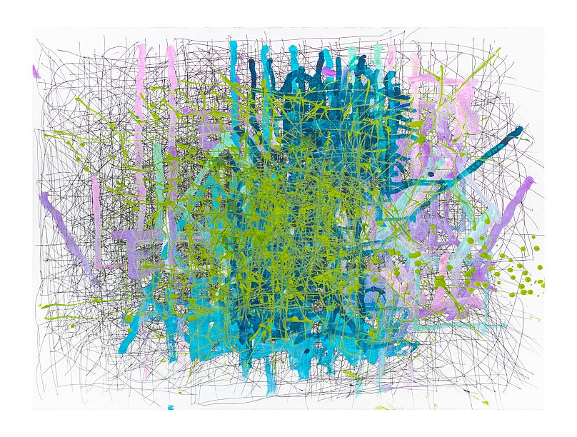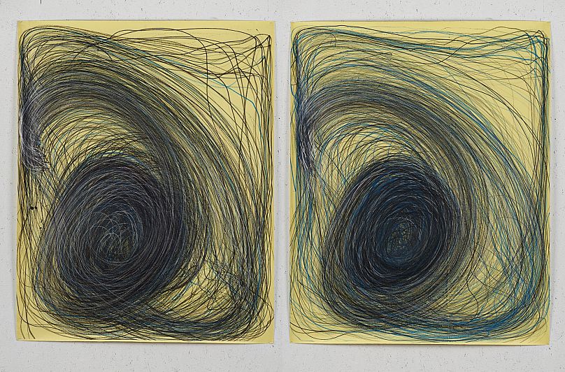 Les dessins et les peintures de Kalu sont souvent produits par paires, faisant écho et se complimentant. L’un des moments forts de l’exposition est sa pièce diptyque Dessin 26, qui illustre son approche de signature de la marque par le mouvement et la répétition. L’œuvre présente deux formes hypnotiques, tourbillonnantes et de type vortex, créées dans des lignes en couches de noir, bleu et violet sur un fond jaune audacieux.