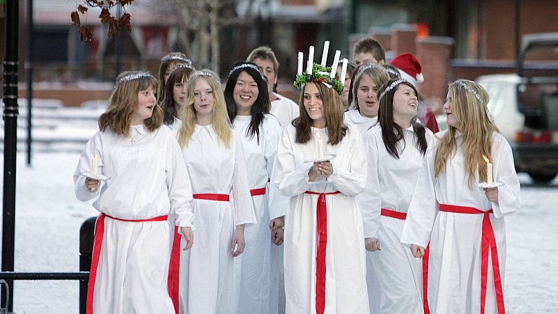 Cette fête des lumières a lieu le 13 décembre – solstice selon l’ancien calendrier julien – en l’honneur de Sainte-Lucie, une jeune chrétienne sicilienne tuée par les Romains en 304 après JC.