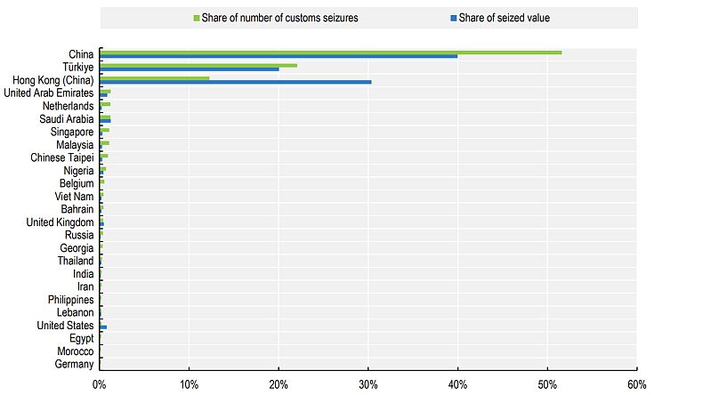 Plus de la moitié des produits contrefaits saisis destinés à l’Union européenne sont venus de Chine, suivis de la Turquie (22%) et de Hong Kong (12%).