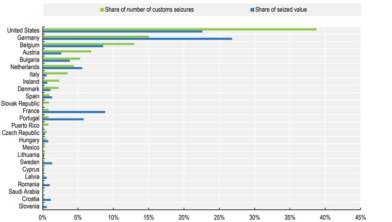 Remarquablement, 20 des 25 meilleures destinations mondiales pour les produits contrefaits sont des États membres de l’UE.