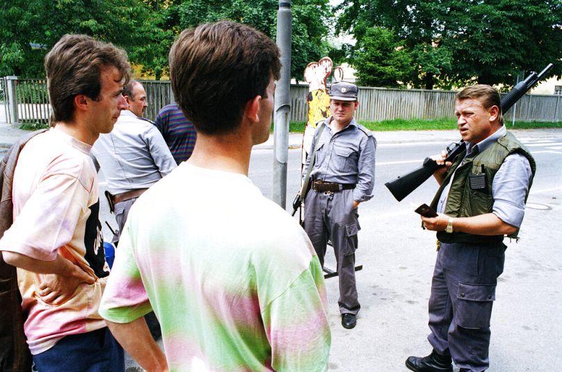 Deux jeunes hommes dans la ville de Slovenska Bistrica, Slovénie, le 9 juillet 1991