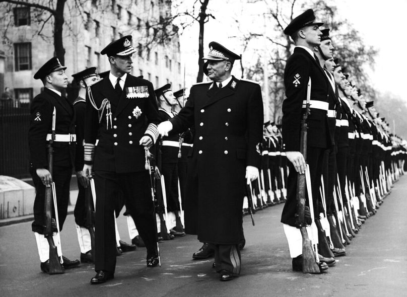 Accompagné du duc d'Édimbourg, à gauche, portant l'uniforme d'amiral, Josip Broz Tito inspecte la garde d'honneur navale à son arrivée à Westminster, Londres, le 15 mars 1953