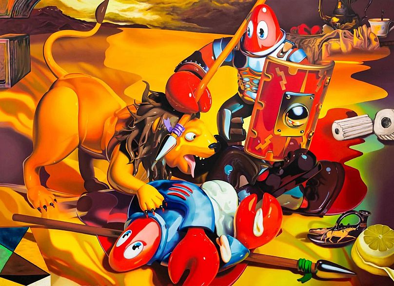 Au 21ème siècle, ma liberté artistique me permet de devenir ce personnage et cette personnalité et d’explorer les dimensions de l’art en tant que plateforme à travers le temps. Je fusionne des éléments de l’Antiquité avec des références contemporaines dans mes peintures, comme dans mes peintures de batailles d’IA, où l’on peut voir des références à la restauration rapide et à la culture hyper pop, associées à des éléments de l’Antiquité.