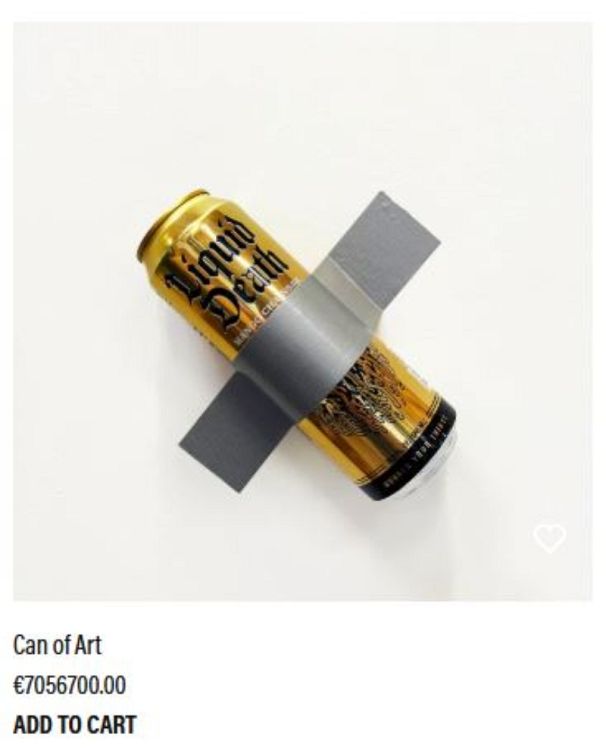 Nos favoris incluent les cookies du malheur (qui, comme leur nom l’indique, contiennent de sombres prédictions pour votre avenir à l’intérieur) ; un jouet pour chat Death Grip (22 €) ; une collaboration Travis Barker pour le Kit Enema of the State (250 € – ne demandez pas) ; et une canette de leur boisson collée au mur, qui non seulement se moque de la fameuse œuvre d’art avec une banane scotchée qui s’est vendue pour des millions cette année aux enchères (nous avons même inclus l’artiste Maurizio Cattelan parmi nos personnalités de l’année), mais qui est également au prix de 7056700,00 € selon leur site internet.