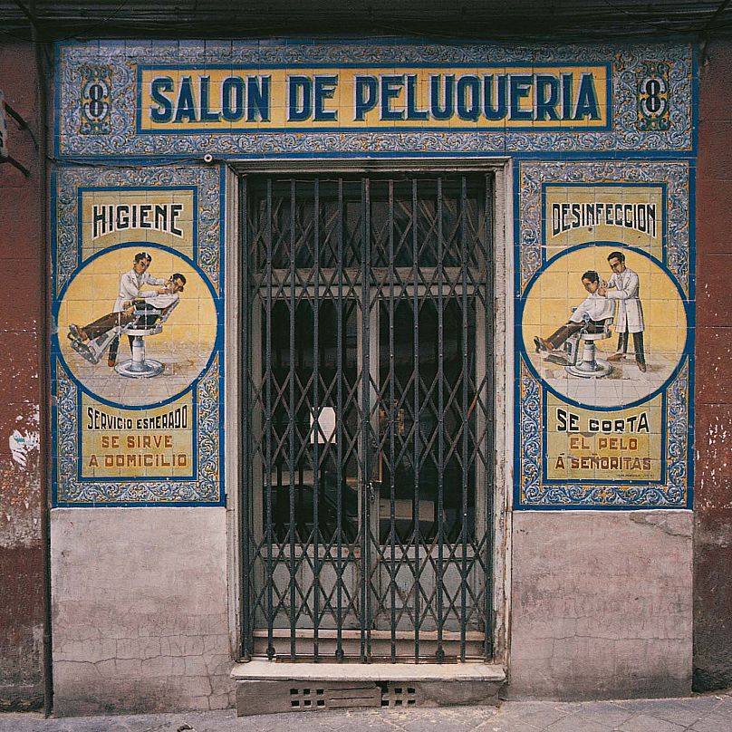 Il cite l’exemple du Salon de Peluqueria, à Lavapiés, un quartier du centre-ville de Madrid. Ce barbier a une devanture avec des carreaux de céramique traditionnels. Au centre de la façade se trouve l’image d’un barbier coupant les cheveux d’un homme dans les images bleues et jaunes.