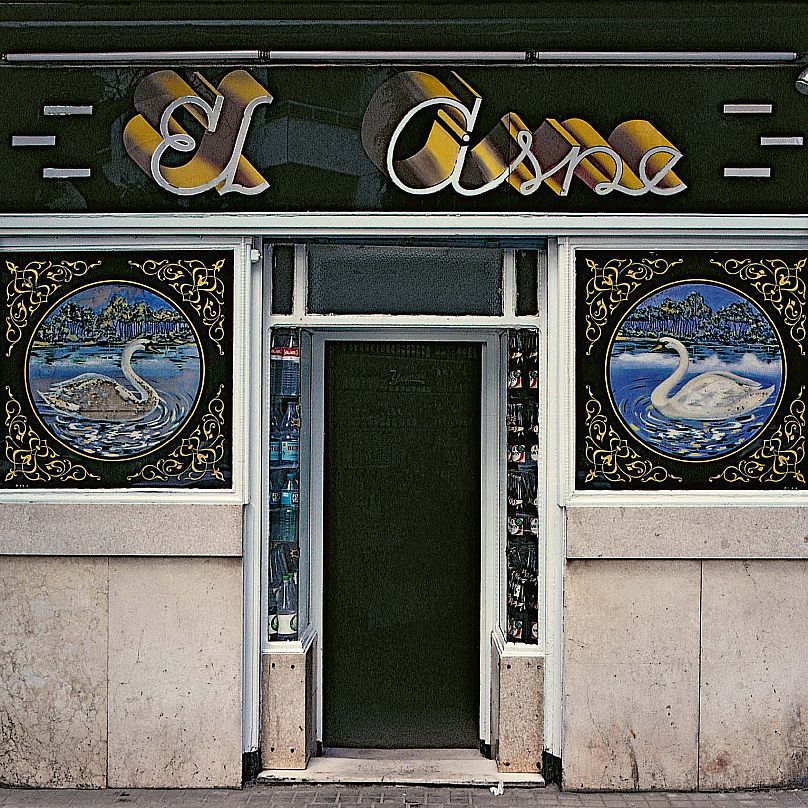 Prendre El Cisné (Le Cygne), qui montre les images de deux cygnes nageant de chaque côté de la porte de ce qui semble être une épicerie à Madrid.