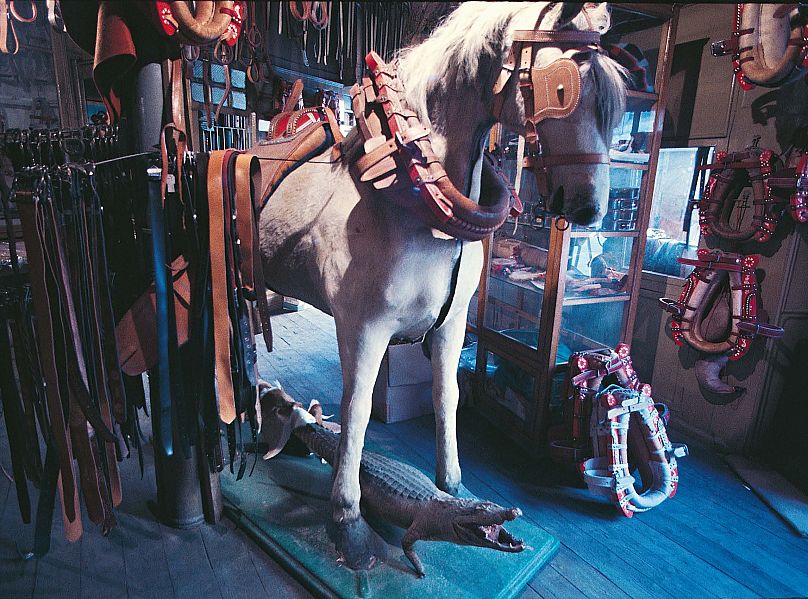 Sur ce thème, un autre magasin de Cantabrie, au nord de l’Espagne, vend du matériel pour chevaux. Ce qui le distingue, c’est un cheval blanc en peluche grandeur nature à l’intérieur du magasin. Sous le cheval se trouve un crocodile en peluche beaucoup plus petit.