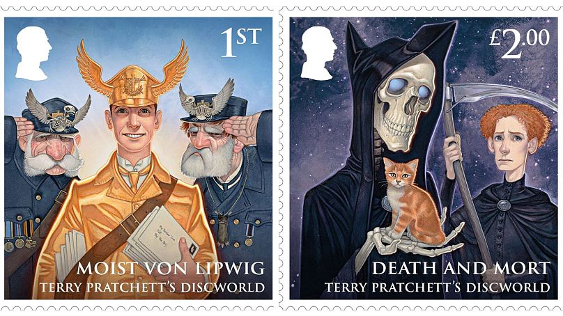 Les huit timbres spéciaux présentent certains des personnages préférés de Discworld, notamment Rincewind, Granny Weatherwax, Sam Vimes, The Librarian et Great A’Tuin, ainsi que des œuvres d’art spécialement commandées de Death and Mort, Moist von Lipwig et Tiffany Aching – toutes créées par Terry Pratchett. illustrateur de choix, Paul Kidby.
