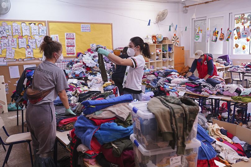 Des vêtements sont triés dans une école utilisée comme centre de distribution pour les personnes ayant besoin de vêtements et de nourriture, dans la banlieue de Valence, en Espagne, le lundi 4 novembre 2024.
