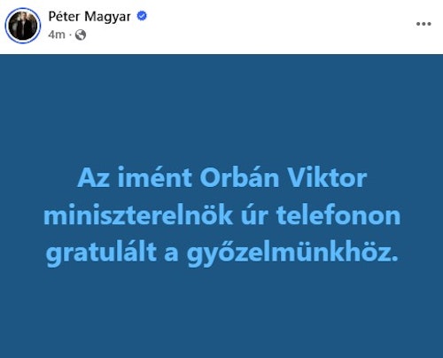 « Prime Minister Viktor Orbán just congratulated us on the phone on our victory, » Magyar wrote.