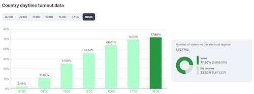 By 6:30 pm local time, just over 77% of eligible voters had cast their votes, making it a record high and a significant increase on the 62% at the last election four years ago.