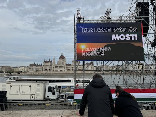Our Chief Europe Editor Maria Tadeo, who is in Budapest to cover the election, reports packed trams and massive queues in the direction of the Tisza election night venue opposite the Hungarian parliament.