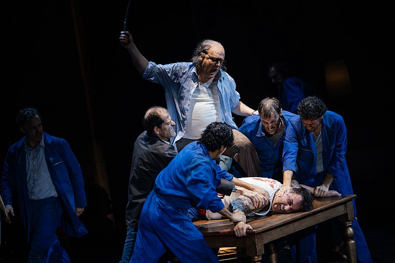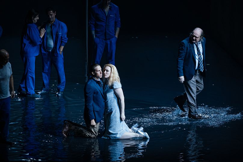 Dix mille litres d’eau dominent la scène du Gran Teatre Liceu comme une métaphore symbolique de la manière dont tous les personnages de cet opéra puissant sont impliqués dans une société criblée de corruption, de sexisme et de meurtres.