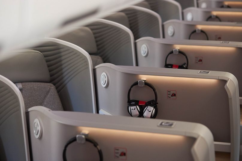 En classe affaires, vous trouverez 14 sièges individuels dotés d’un large appui-tête en cuir et pouvant être transformés en lits entièrement plats.