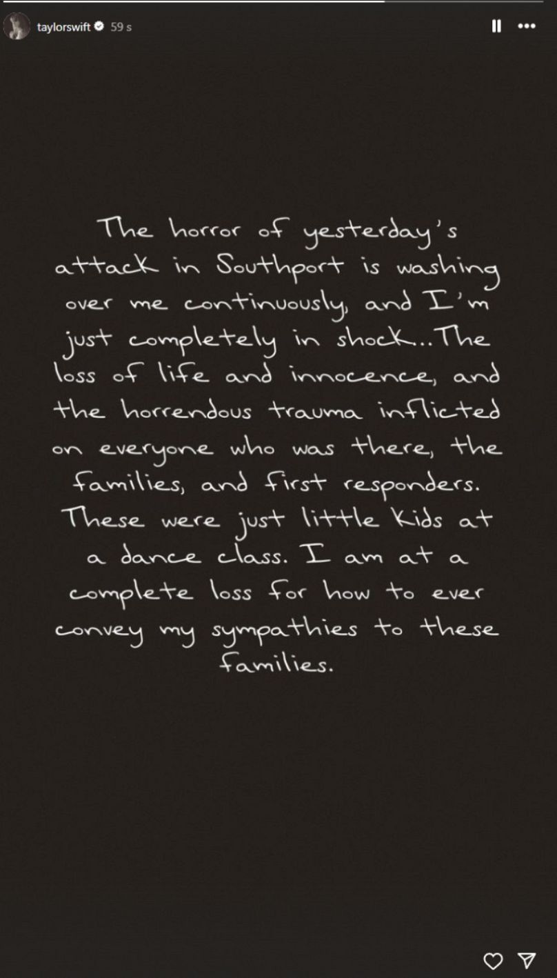Suite à l’annonce de la mort de deux enfants et de neuf autres blessés après une attaque au couteau à Southport, une ville balnéaire près de Liverpool, lors d’un événement de danse sur le thème de Taylor Swift, la chanteuse a partagé un message sur Instagram à propos de l’attaque meurtrière.