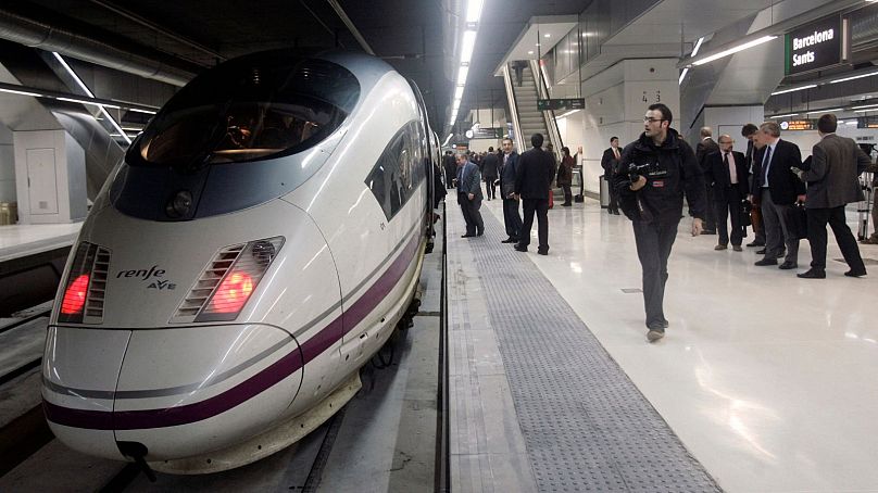 Un train avenue à grande vitesse, lors de son premier voyage entre Madrid et Barcelone, arrive à Barcelone, en Espagne, février 2008.