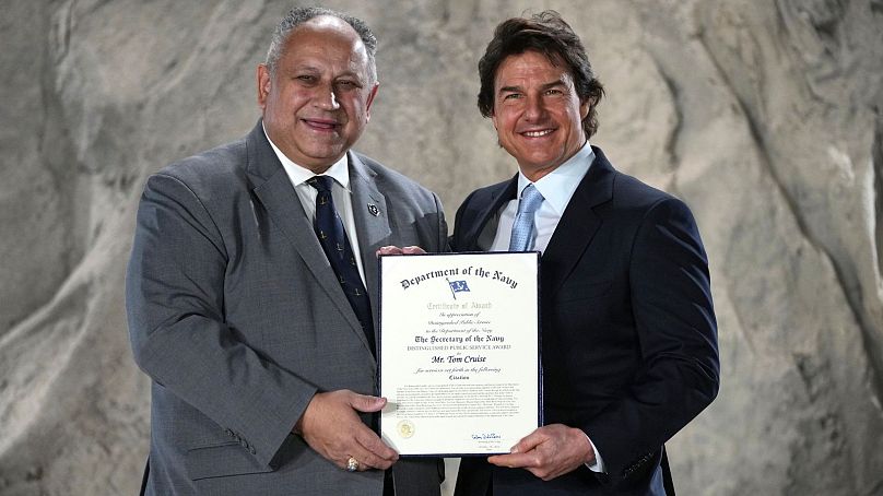 Cruise, qui a tourné au Royaume-Uni, a reçu le Distinguished Public Service Award des mains du secrétaire américain à la Marine, Carlos Del Toro, lors d’une cérémonie aux studios Longcross, près de Londres.