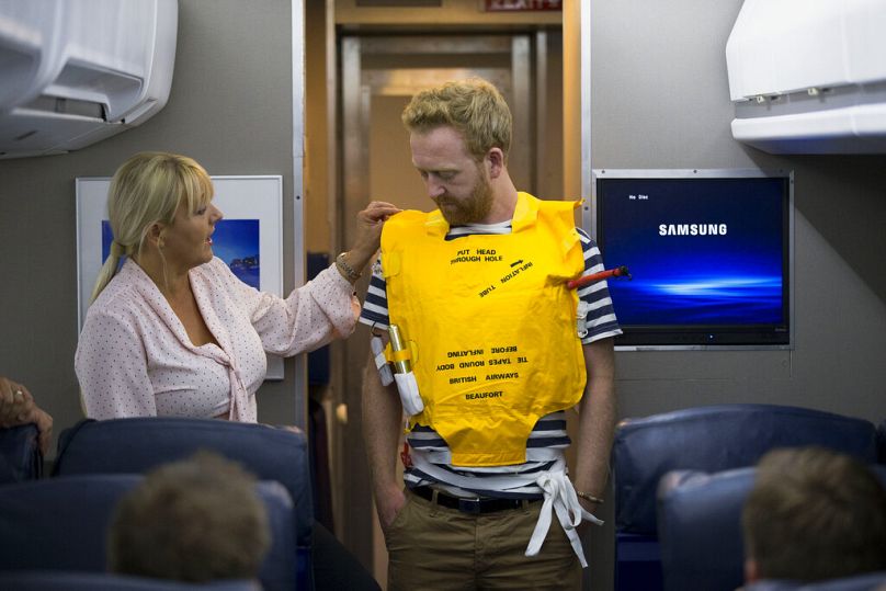Un instructeur de sécurité de vol British Airways montre des caractéristiques sur un gilet de sauvetage