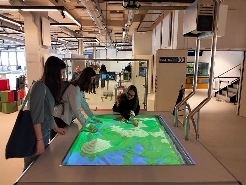 Un autre groupe d’élèves se déroule pour jouer au football de table contre un robot. Lorsque nous allons regarder le jeu, l’écran affiche un 3 pour le robot et un 0 pour les humains. D’autres sont joués dans le sandbox de réalité augmentée, où ils peuvent façonner et visualiser les niveaux topographiques. D’autres essaient de mettre leurs doigts sur des plaques conductrices électriquement qui leur donnent un petit choc électrique. Ceci est une expérience haute tension!
