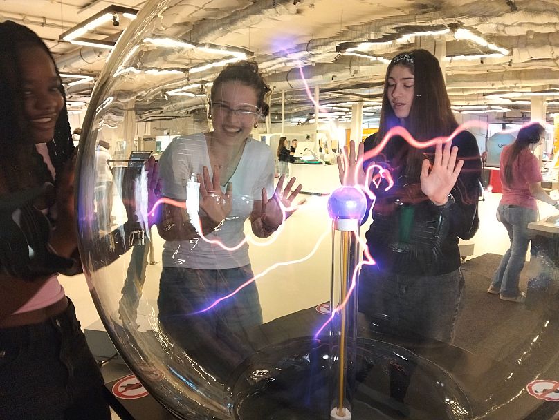 Un groupe d’étudiants s’approche de la boule de plasma, l’une des plus grandes du monde. Ils placent leur main sur le verre et voient comment le champ électrique est modifié, formant des poutres épaisses dirigées vers leurs mains.