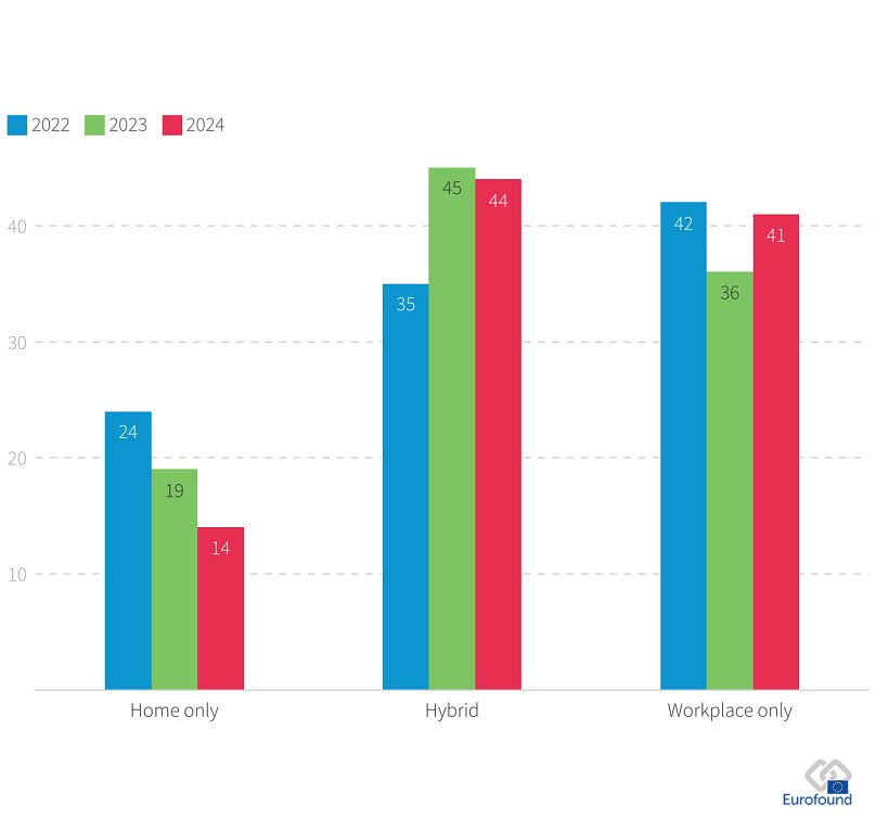 Dans le même temps, et malgré une baisse de 1% l’année dernière, le travail hybride reste l’accord le plus courant (44%) parmi les employés de l’UE dans des rôles qui peuvent également être effectués à distance.